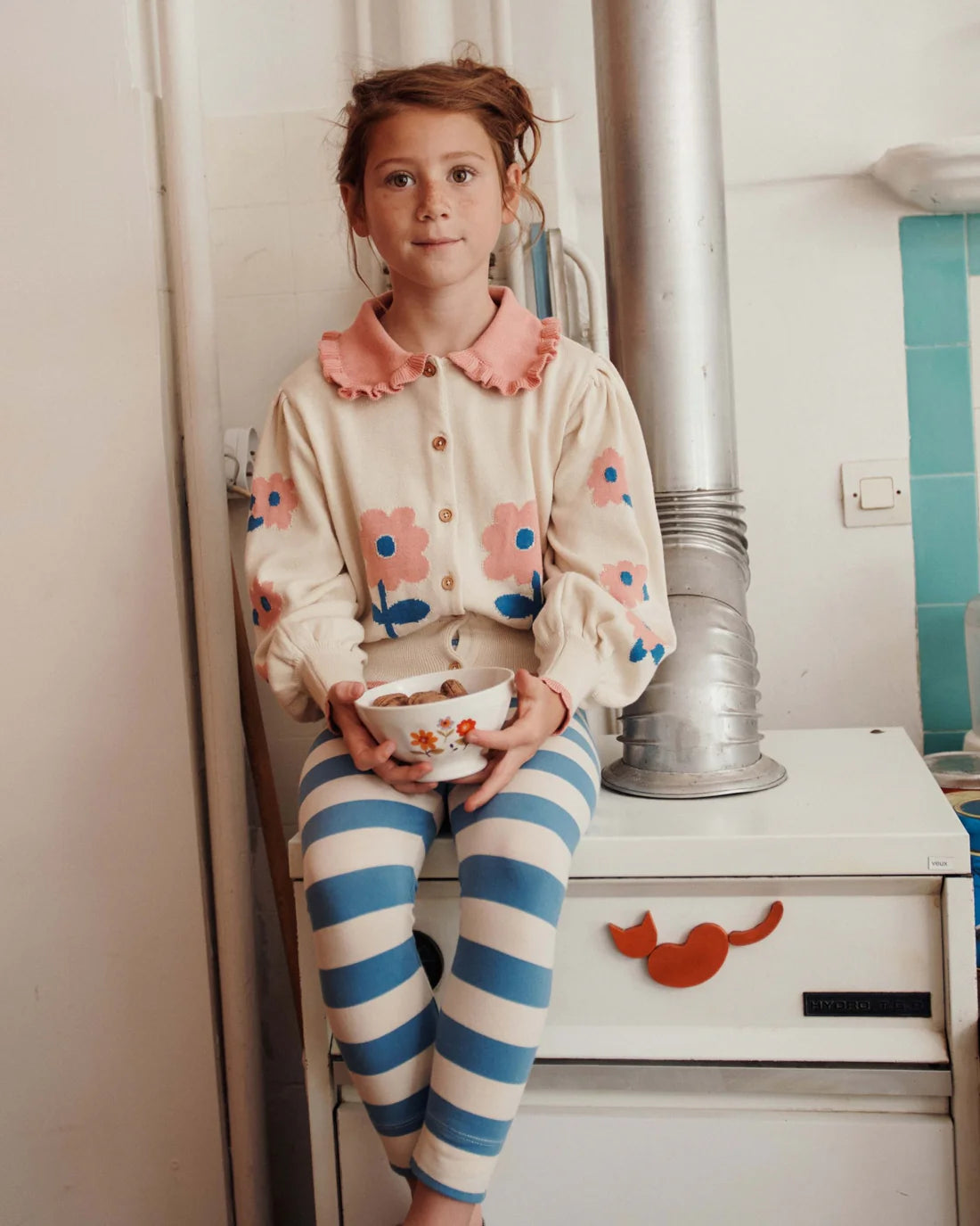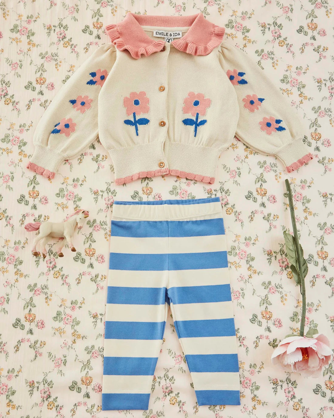 Introducing the EMILE AT IDA cardigan—a charming piece crafted from soft organic cotton jersey. This light beige sweater features delicate pink flowers blooming across the front and sleeves, paired with a sweet ruffled pink collar and scalloped trim along the hem and cuffs. The relaxed wide sleeves and crew neckline create an effortless, playful silhouette, while wooden buttons and ribbed cuffs add timeless details. Perfect for layering with style and comfort.