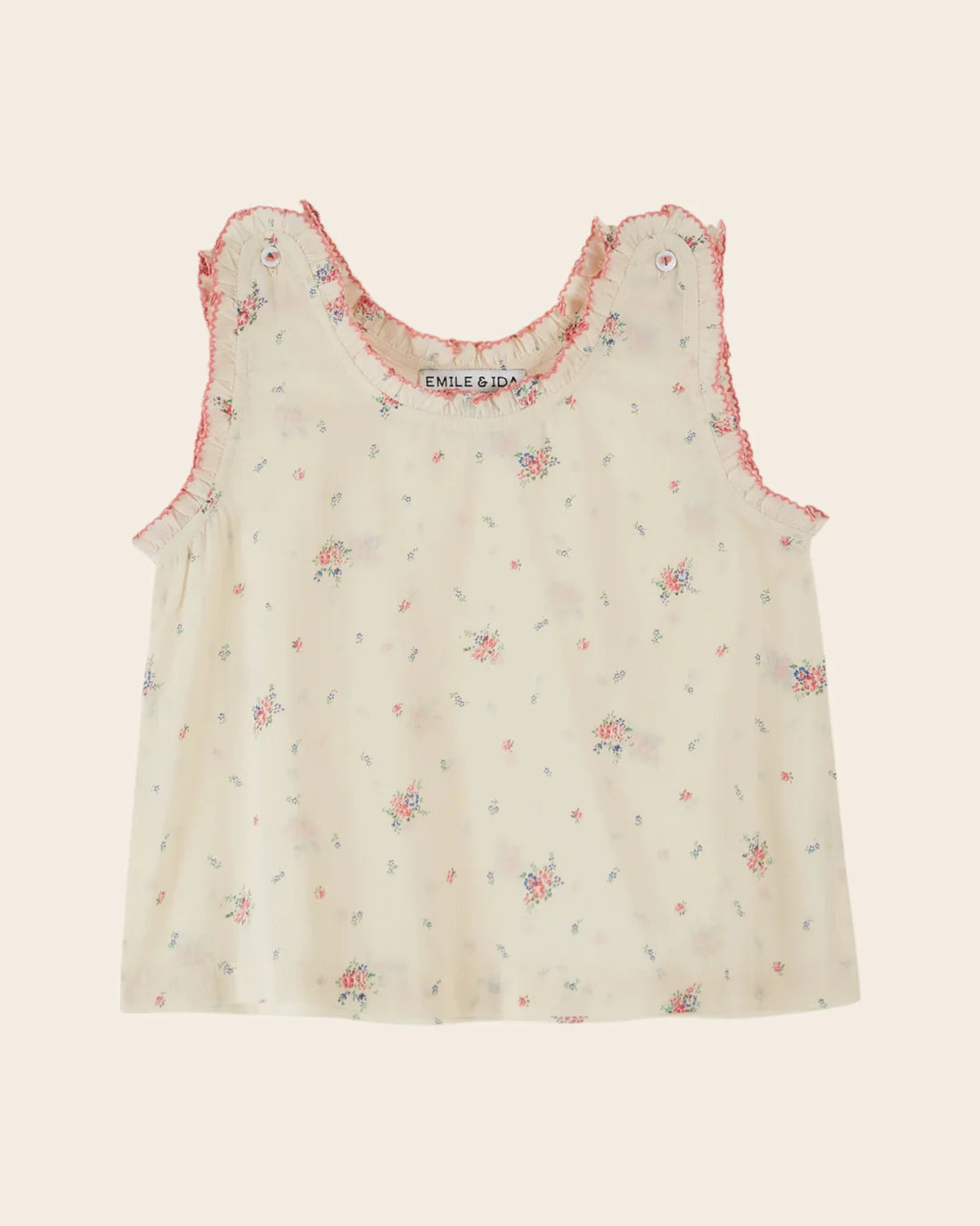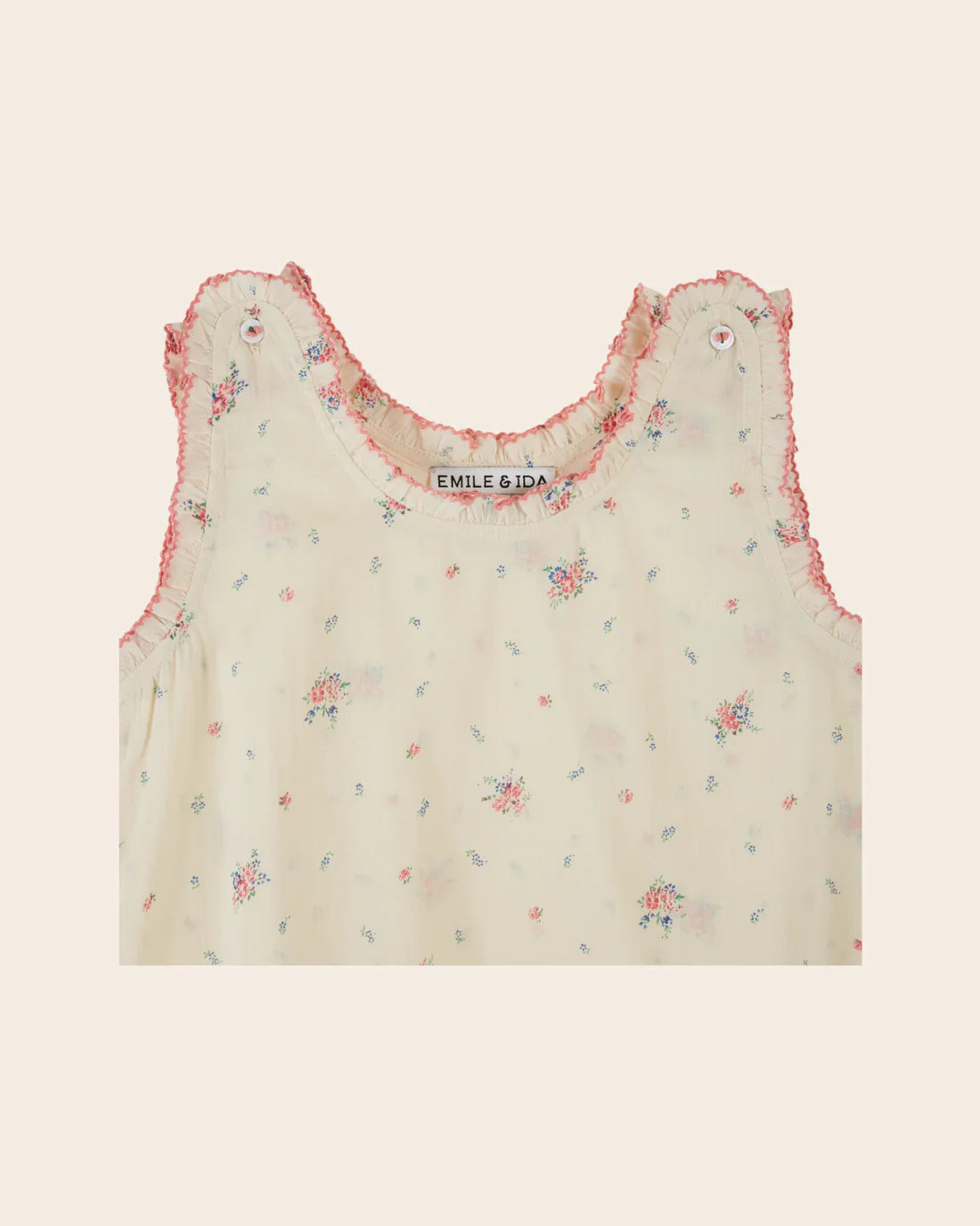 Lightweight and breezy, this strap top is crafted from organic cotton voile in a soft ecru base, adorned with delicate pink bouquets and floral prints throughout. Perfect for warm summer days, it features charming ruffled and scalloped edges along the neckline and hem, with convenient buttoned shoulder openings for easy dressing. Thoughtfully constructed with French seams on the sides, front lining, and impeccable finishing details for a polished look that lasts.